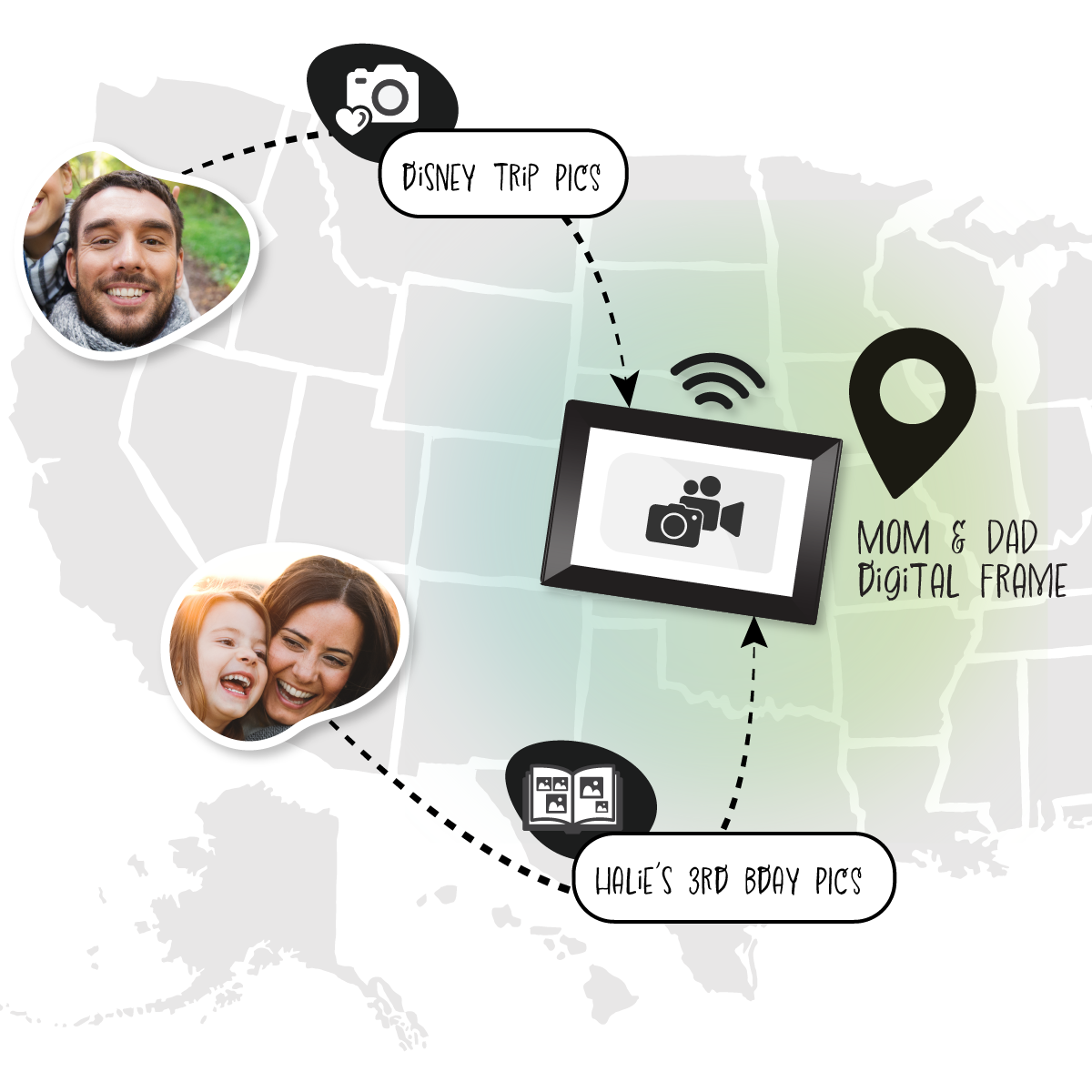 Surprise your loved ones with new photos, from anywhere in the world, that appear instantly.