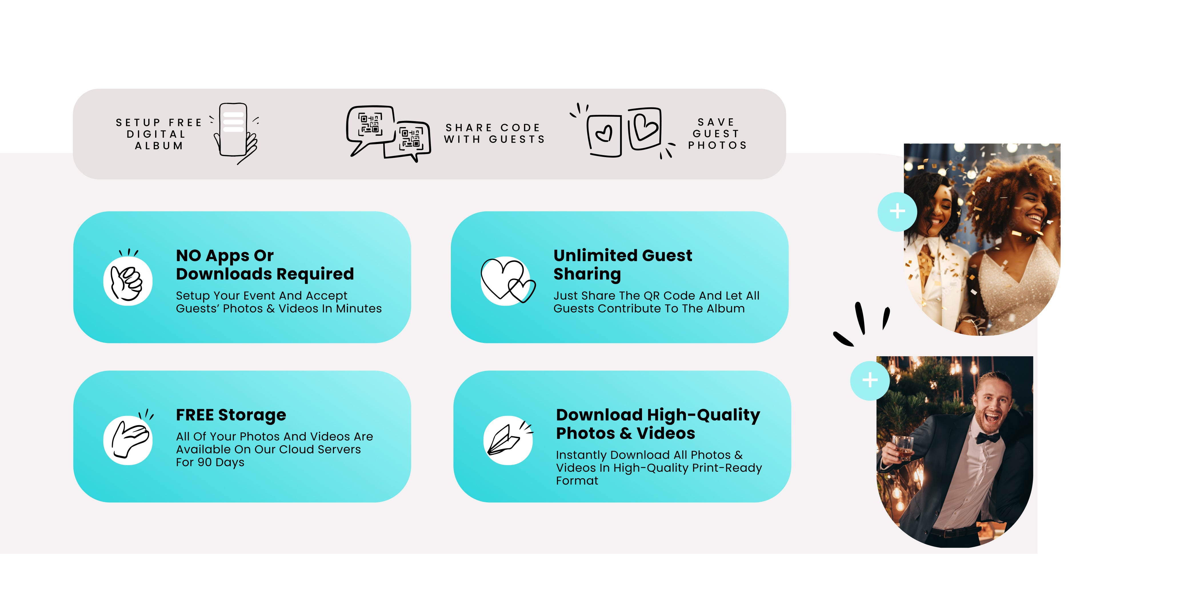 Gather all your guests' snapshots in one spot now! Leave behind the endless hunt for hashtags on social media and the slow drip of group texts. Everyone loves sharing their moments as they happen, bringing an extra layer of excitement and connection to any event. It's all about making gatherings irresistibly engaging and filled with fun!