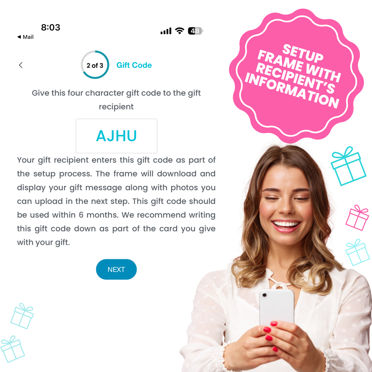 Be sure to share this special code with your gift recipient. When they enter this code during frame setup, the pre-loaded photos and videos will download and appear on the frame!