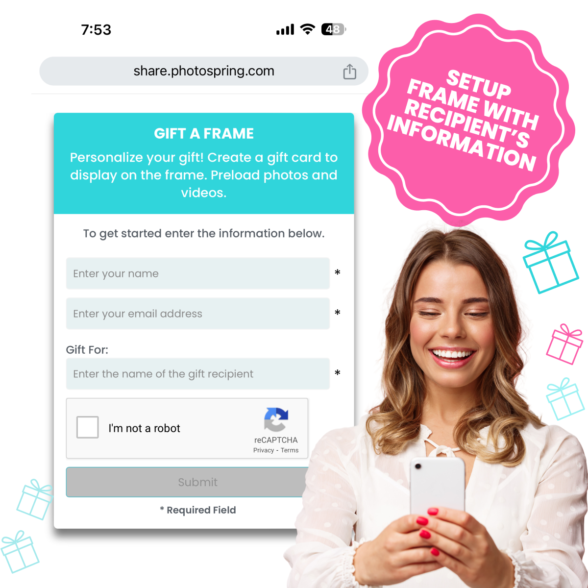 To setup your frame as a gift, first you will need to visit this link to get started. When setting up the frame, make sure to enter your name and email, and the recipient's name in the prompts.