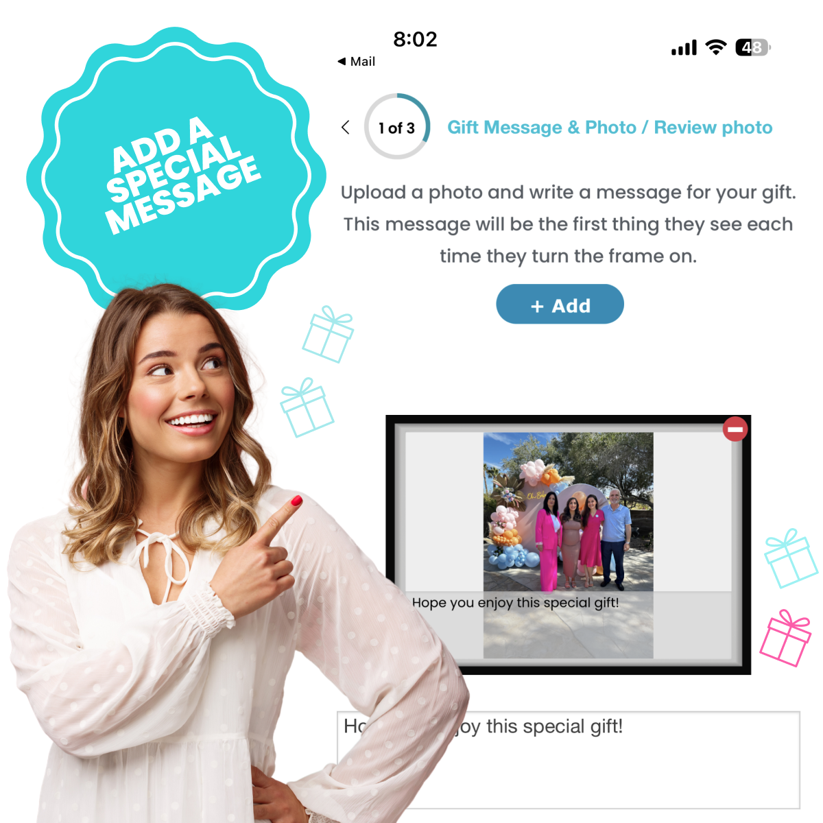 Ready to take gift giving to the next level? Enhance your gift with personalized photos and videos in the frame before presenting it to your loved one. Include a heartfelt message with your frame for an extra special touch!
