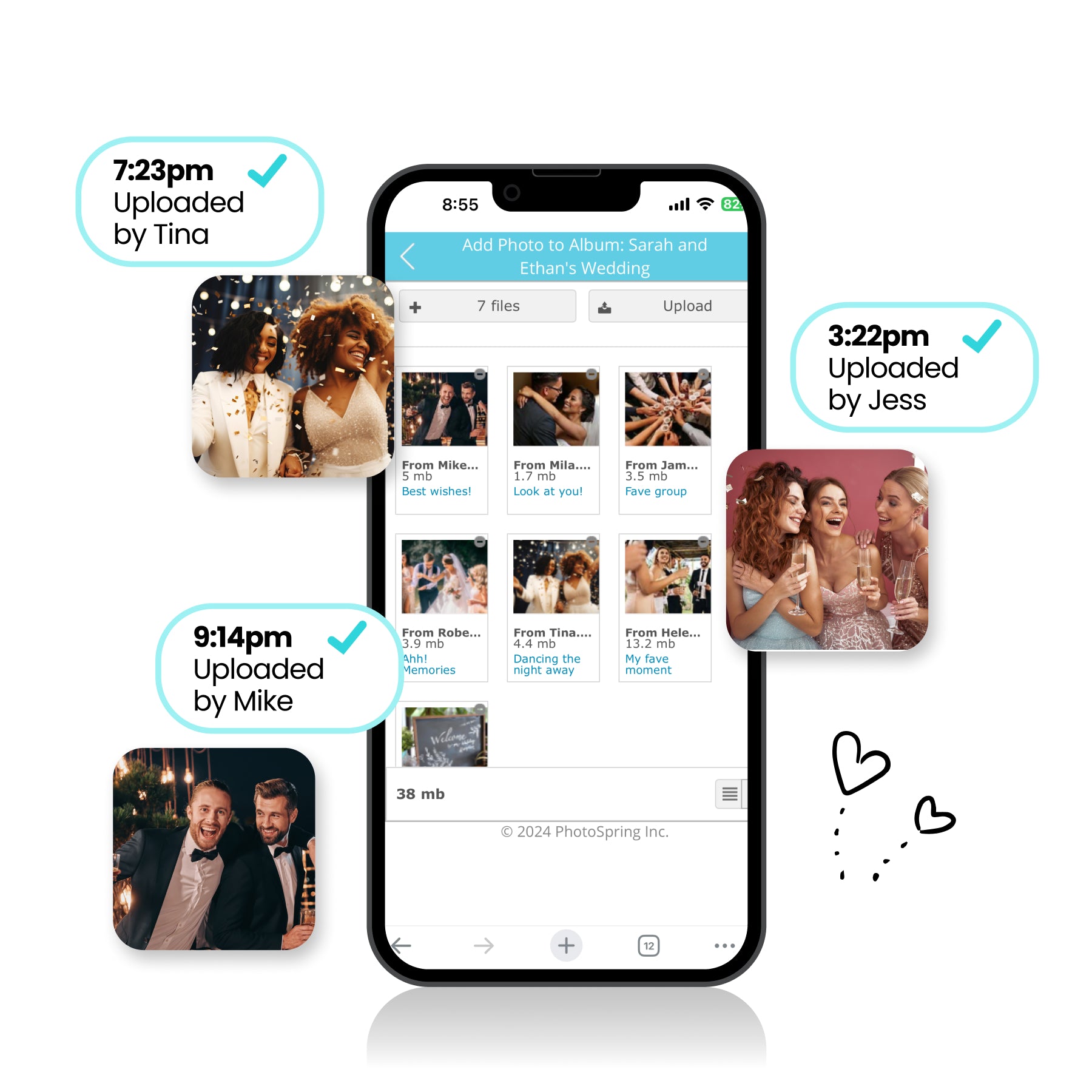 We used PhotoSpring's sharing service for our wedding reception. The guests shared so many beautiful memories with us. We set up the photos on a live slideshow and people loved sharing their photos in real-time.